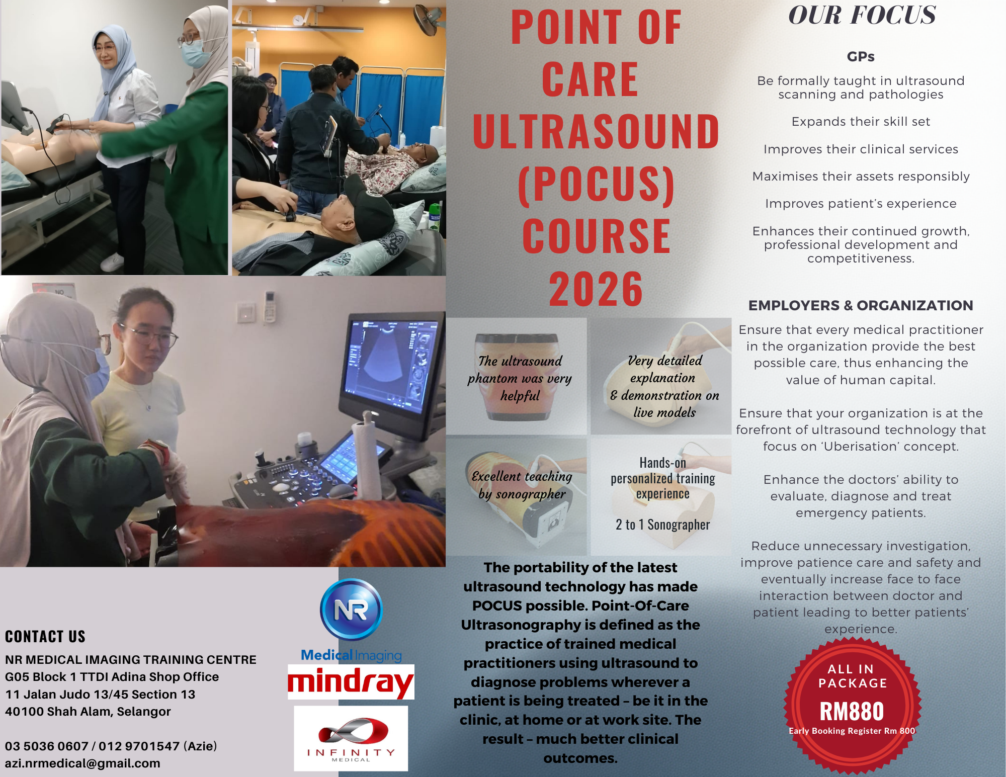 This is a hands-on workshop with minimum participant number per slot to maximize your learning experience. 1.To train the GPs in performing quick scans to answer specific questions. 2.To enable the GPs to make better clinical decision and instituting appropriate treatment. 3.To assist the GPs to refer to appropriate specialists. 4.To improve clinical outcome by shortening the diagnostic process and reducing the time to definitive treatment. 5.To ensure patient safety is uphold at all times. Venue: Seminar Room, NR Medical Imaging Sdn Bhd, 105, TTDI Adina Shop Office, Seksyen 13, 40100 Shah Alam, Selangor. This is IMPORTANT! Please check the slot availability first with Pn Azie at +6012 970 1547. **Slots are limited** (3 Hours)