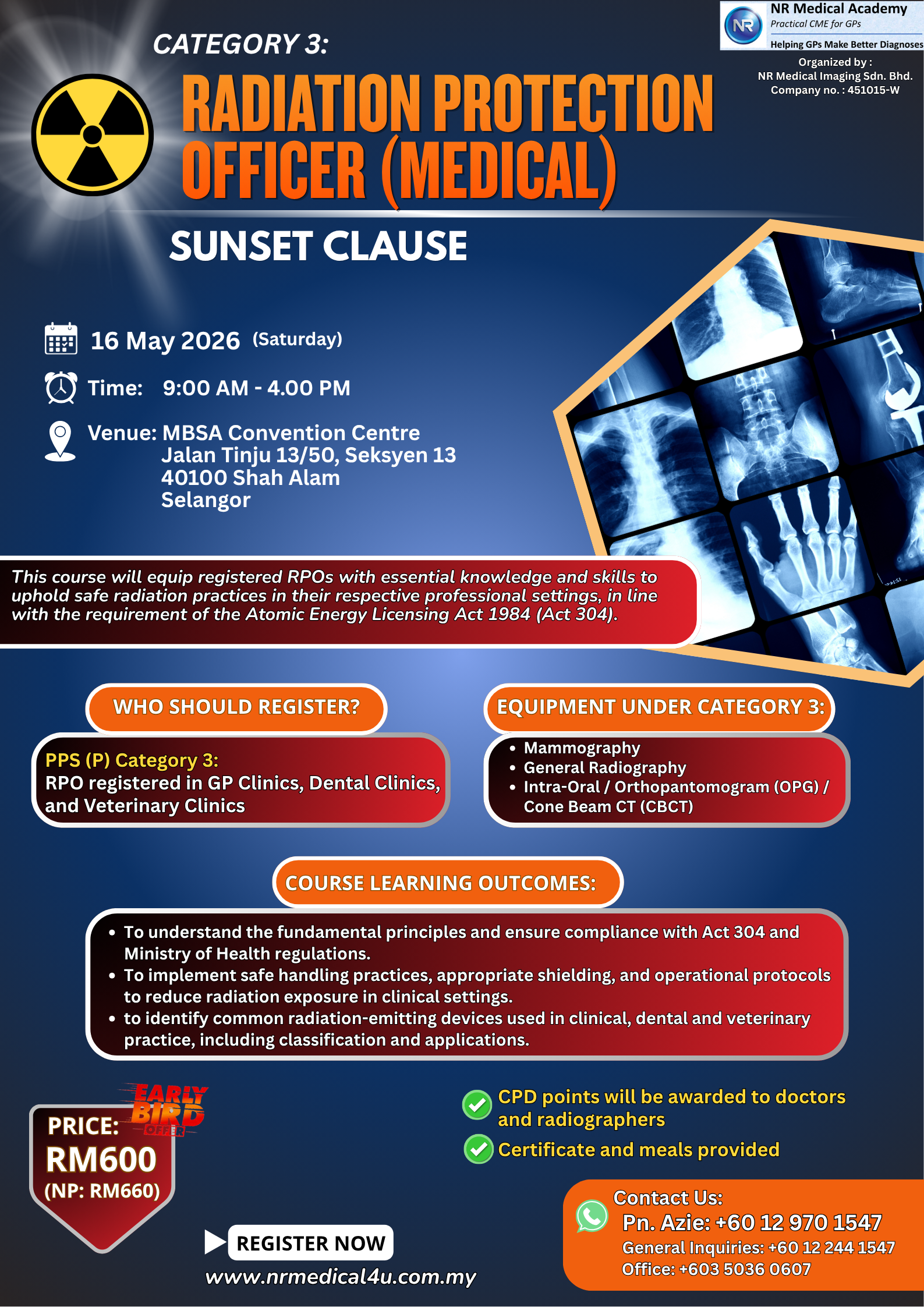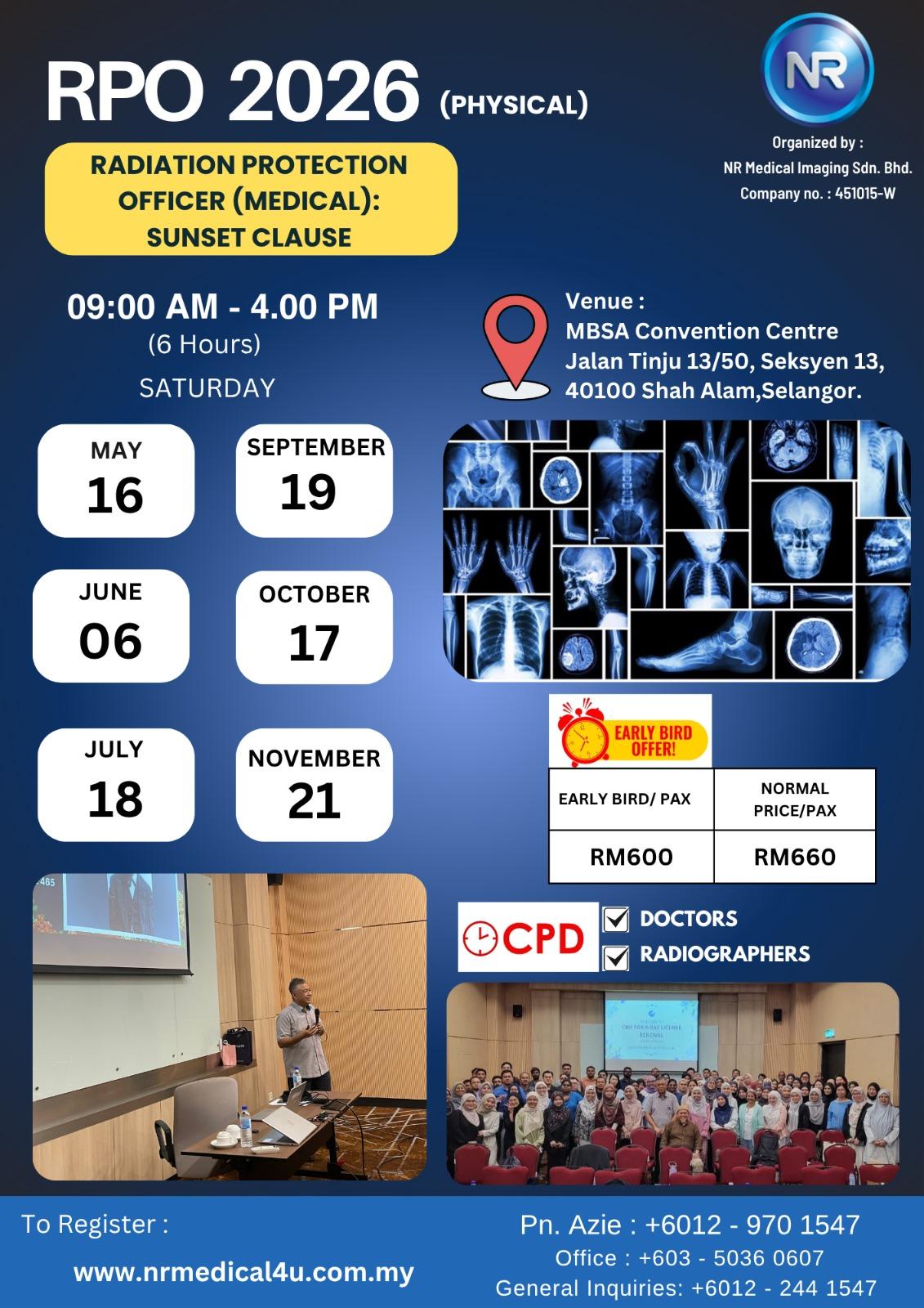 This course will equip registered RPOs with essential knowledge and skills to uphold safe radiation practices in their respective professional settings, in line with the requirement of the Atomic Energy Licensing Act 1984 (Act 304).