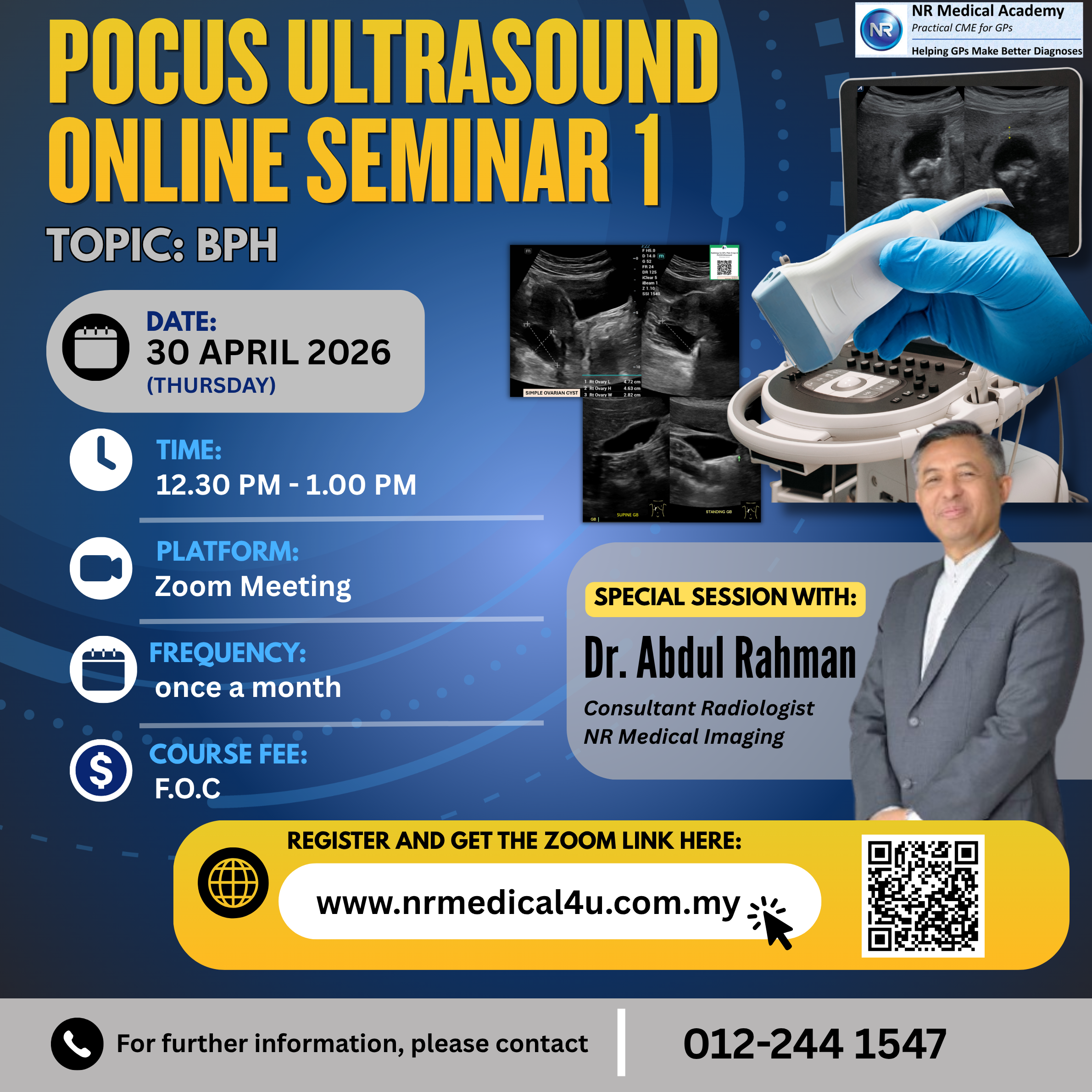 Enhance your ultrasound knowledge and gain valuable insights through real clinical case discussions, designed to support doctors in making accurate and confident decisions in everyday practice. Suitable for doctors and sonographers. Platform: Zoom Meeting Frequency: once a month Time: 12.30pm - 1.00pm Duration: 1/2 hour Course Fee: FOC Contact 012-244 1547 for more info